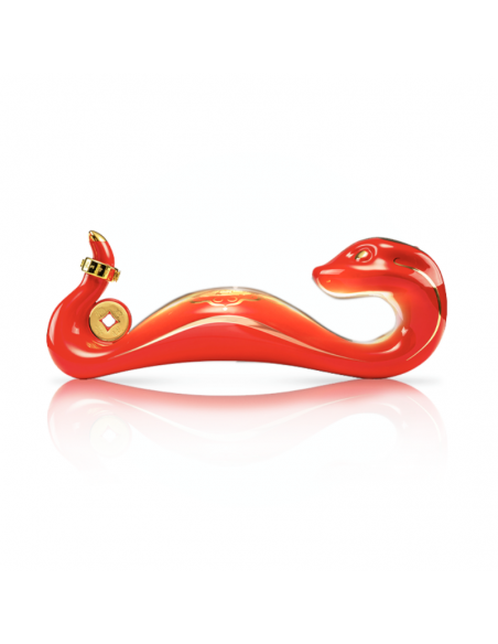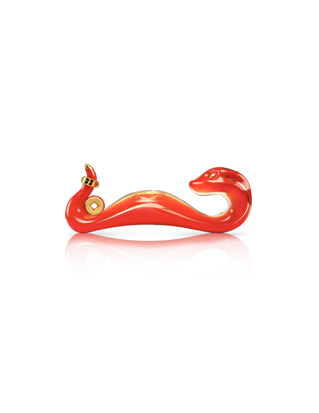 Conçue par le maître de renommée internationale Zhang Chaoyang, cette œuvre s’inspire d’une profonde créativité et se pare d’une porcelaine impériale signée Yongfengyuan. Ornée d’un émail rouge festif, elle met en scène le serpent, empreint de grâce et de spiritualité, à la silhouette fluide et élégante, symbole de sagesse et de persévérance. Sur sa tête repose un lingot d’or, gage de prospérité, tandis que ses lignes rivalisent avec celles d’une supercar, incarnant l’harmonie et l’élégance.