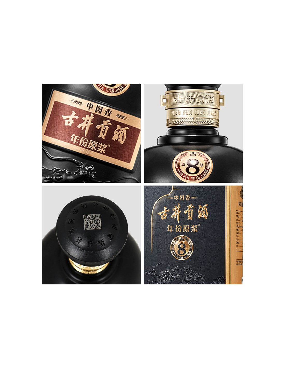 外盒采用高科技光刻定位纸材质,防伪功能增强;瓶身采用玻璃喷涂工艺,纯黑色,健康环保;瓶型似盘龙玉玺,古朴稳重,寓意皇室贡品和权贵象征;瓶体砂金烤花;整体凸显内在的高贵。